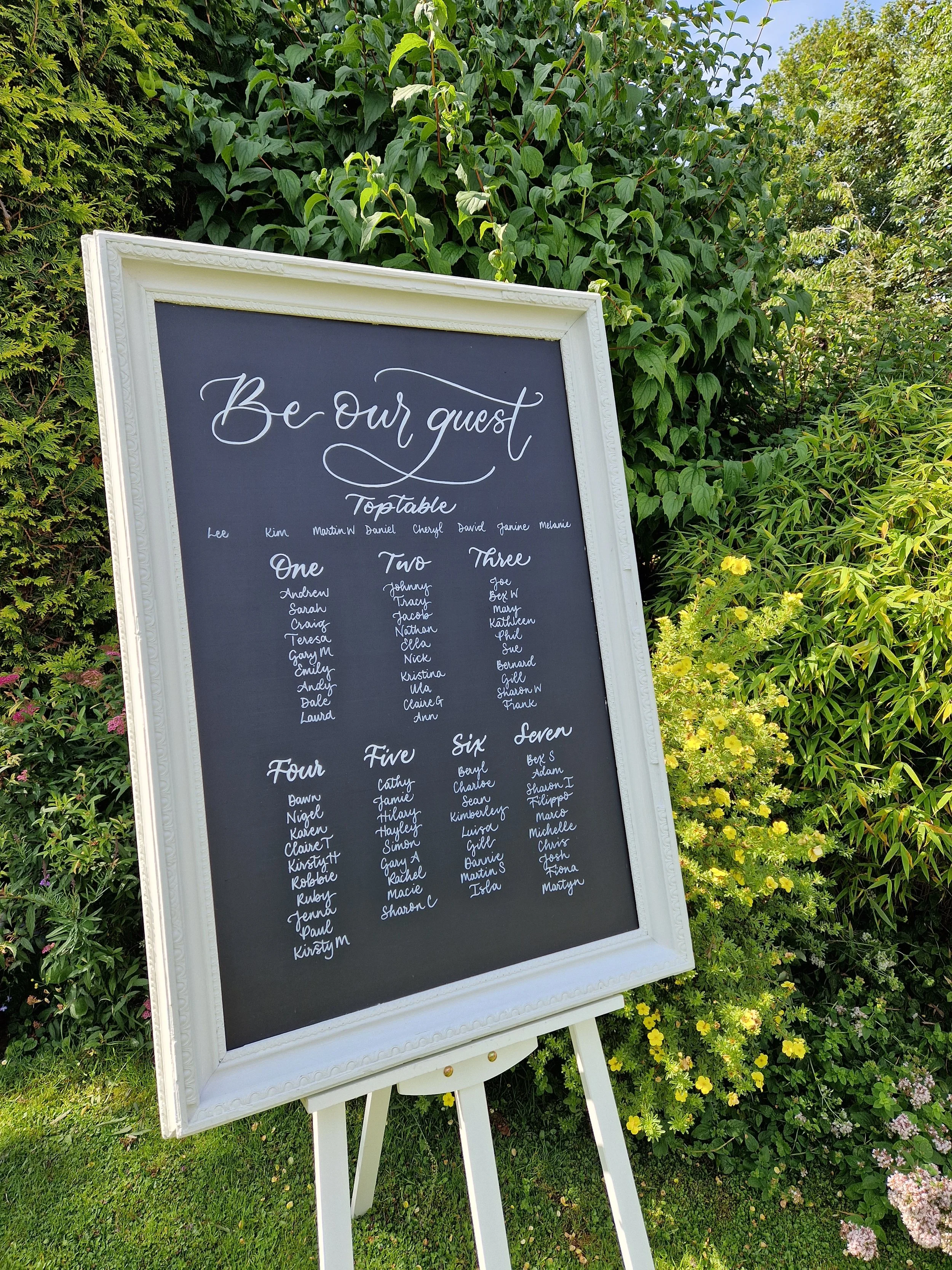 Handwritten mirrors for weddings are my speciality and table plans are just one of the ways you can bring a beautiful mirror to life. They complement any colour scheme and are so elegant too. Use your own mirror, hire from me, or hire from a number of suppliers I know and recommend, all based in Nottinghamshire, Derbyshire, Leicestershire & Rutland in the East Midlands. Don’t just limit the table plan to a mirror though - scroll down for more ideas on blackboards and acrylic too. For weddings abroad I have also made a number of “flat pack” solutions on card to simply hang or pin when you get to your venue, ideal for taking with you in your hand luggage.For larger items I am based in Melton Mowbray, Leicestershire. For smaller items such as paper and card based stationery, this can be posted worldwide.
