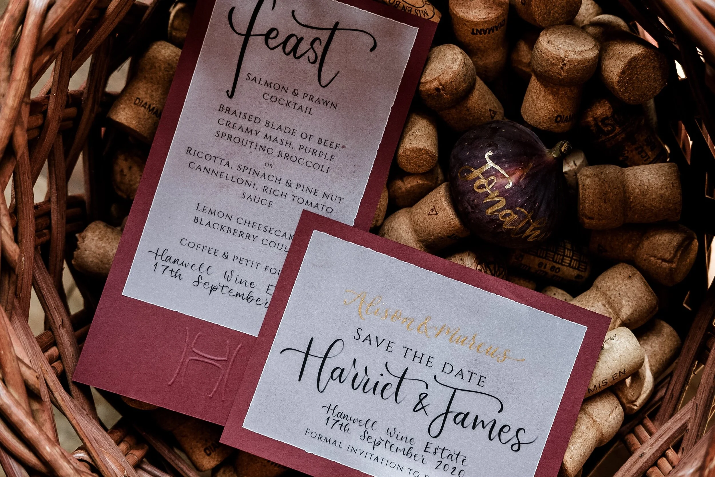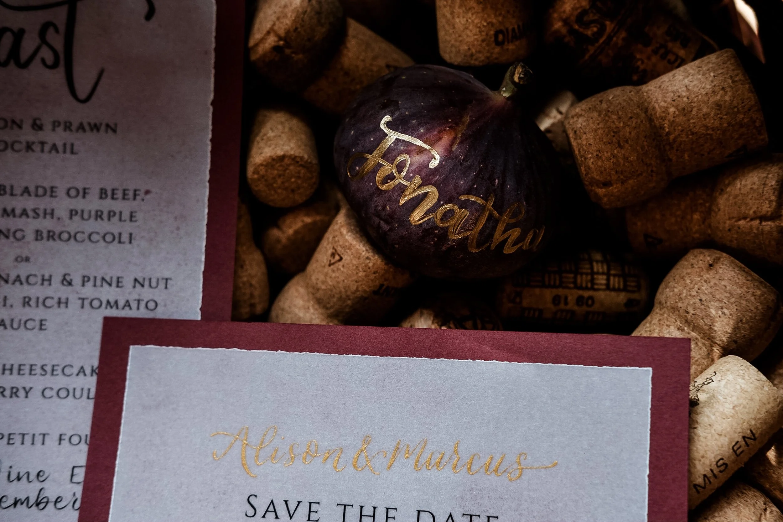 A close-up of a basket filled with wine corks, featuring a fig with "Jonathan" written on it and two event cards. One card lists a menu with items like salmon & prawn cocktail and lemon cheesecake. The other is a "save the date" announcement for an e