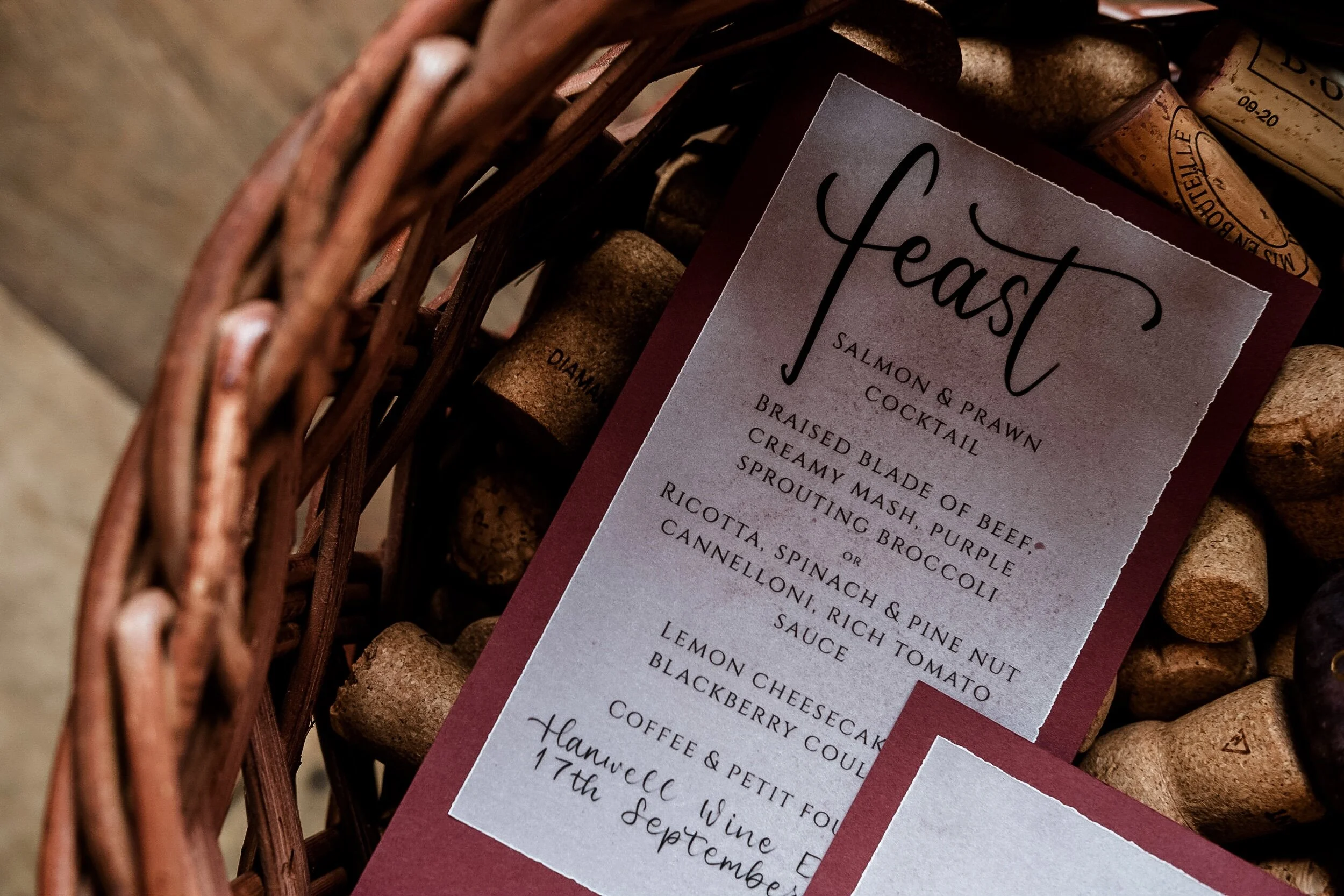A close-up of a wicker basket filled with wine corks and a menu card titled "Feast." The menu describes a meal including salmon and prawn cocktail, braised blade of beef, ricotta cannelloni, lemon cheesecake, along with mentions of coffee and petit f