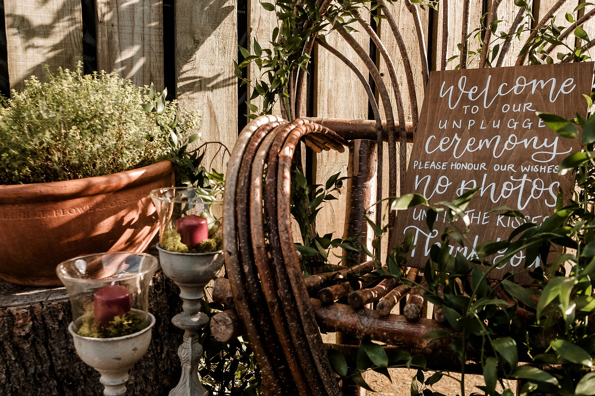 Rustic wedding decor with wooden chair, greenery, candles, and a "Please No Photos" sign.