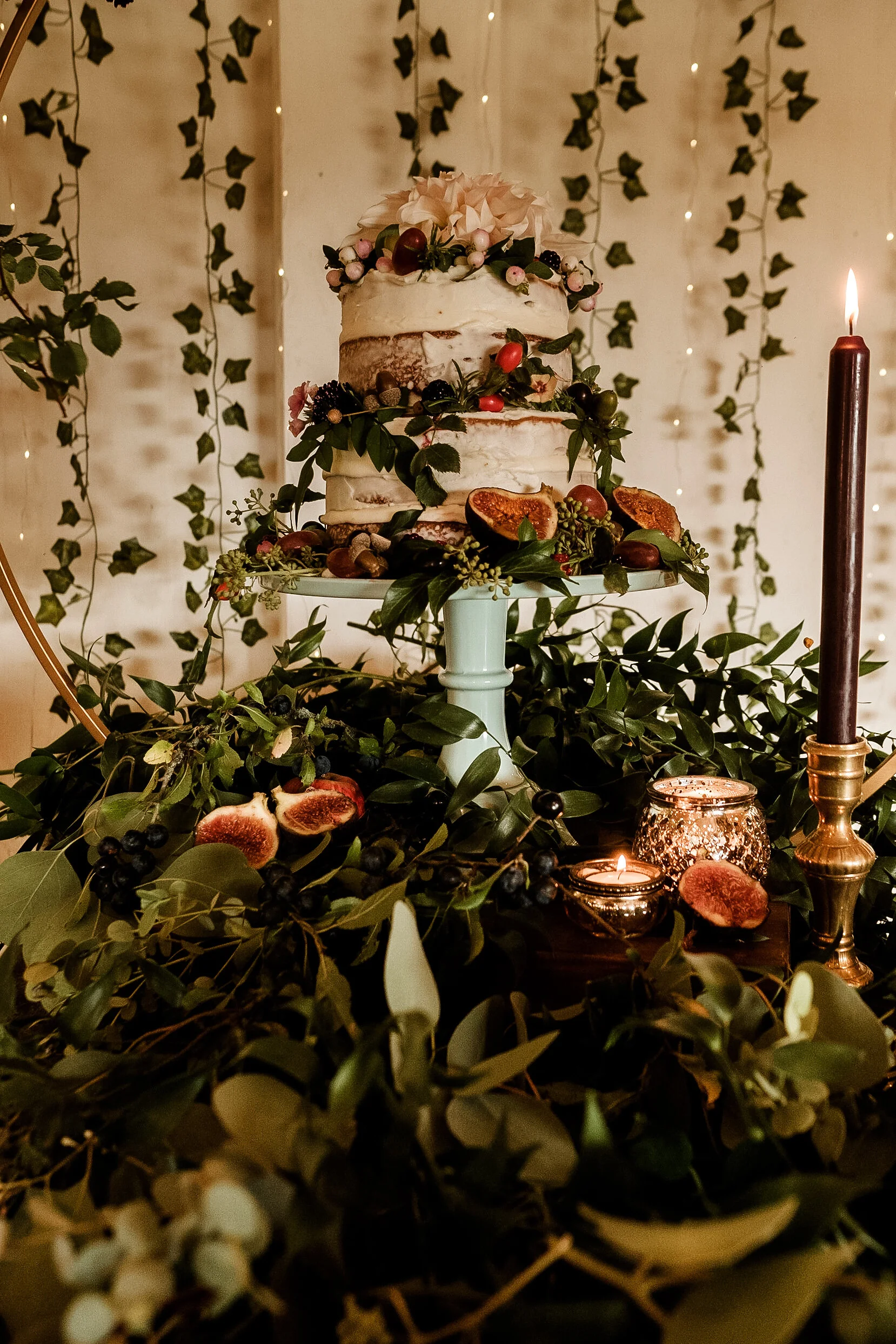 Rustic wedding cake surrounded by greenery with figs, blackberries, and lit candles on a decorative table.