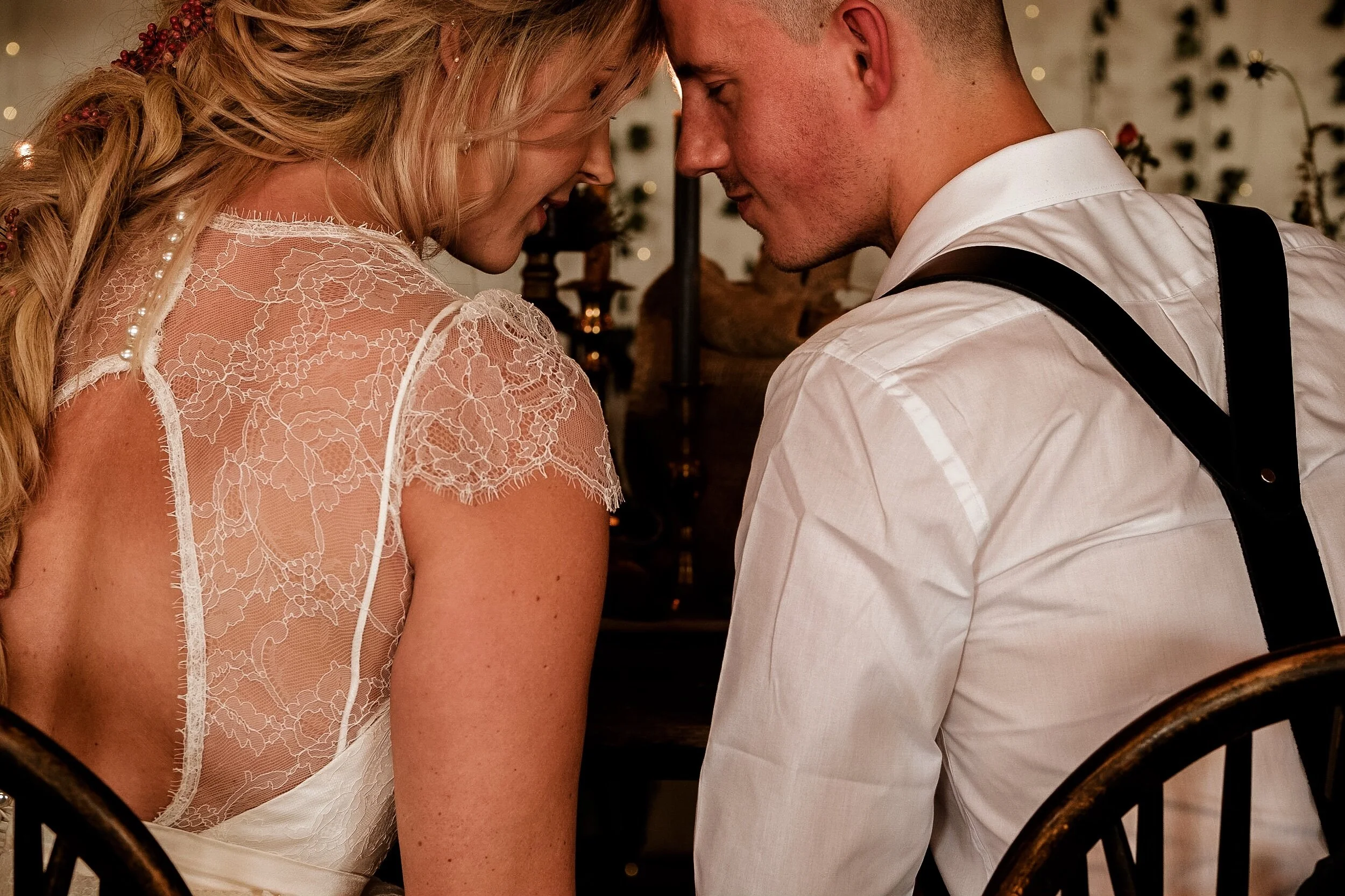 Close-up of a couple leaning in with foreheads touching, wearing formal attire; woman's dress has lace and floral detail.