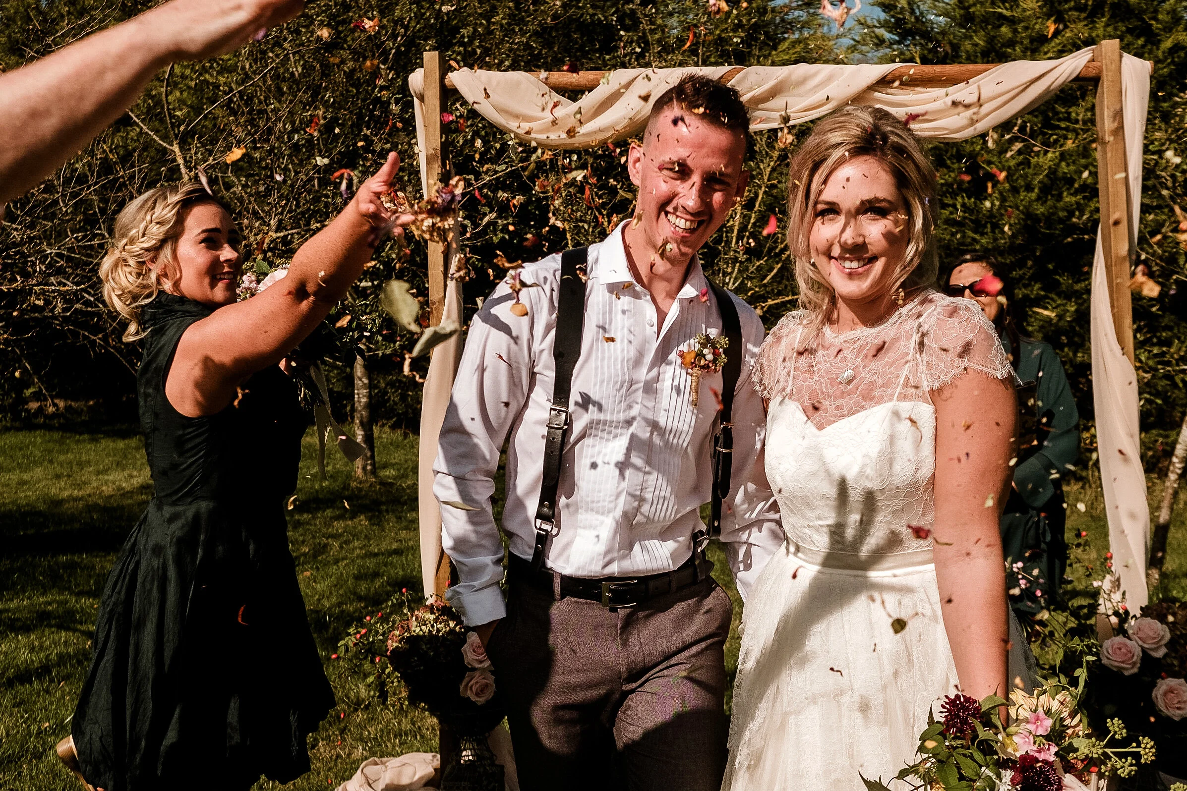Couple smiling at outdoor wedding ceremony, surrounded by guests throwing flower petals.