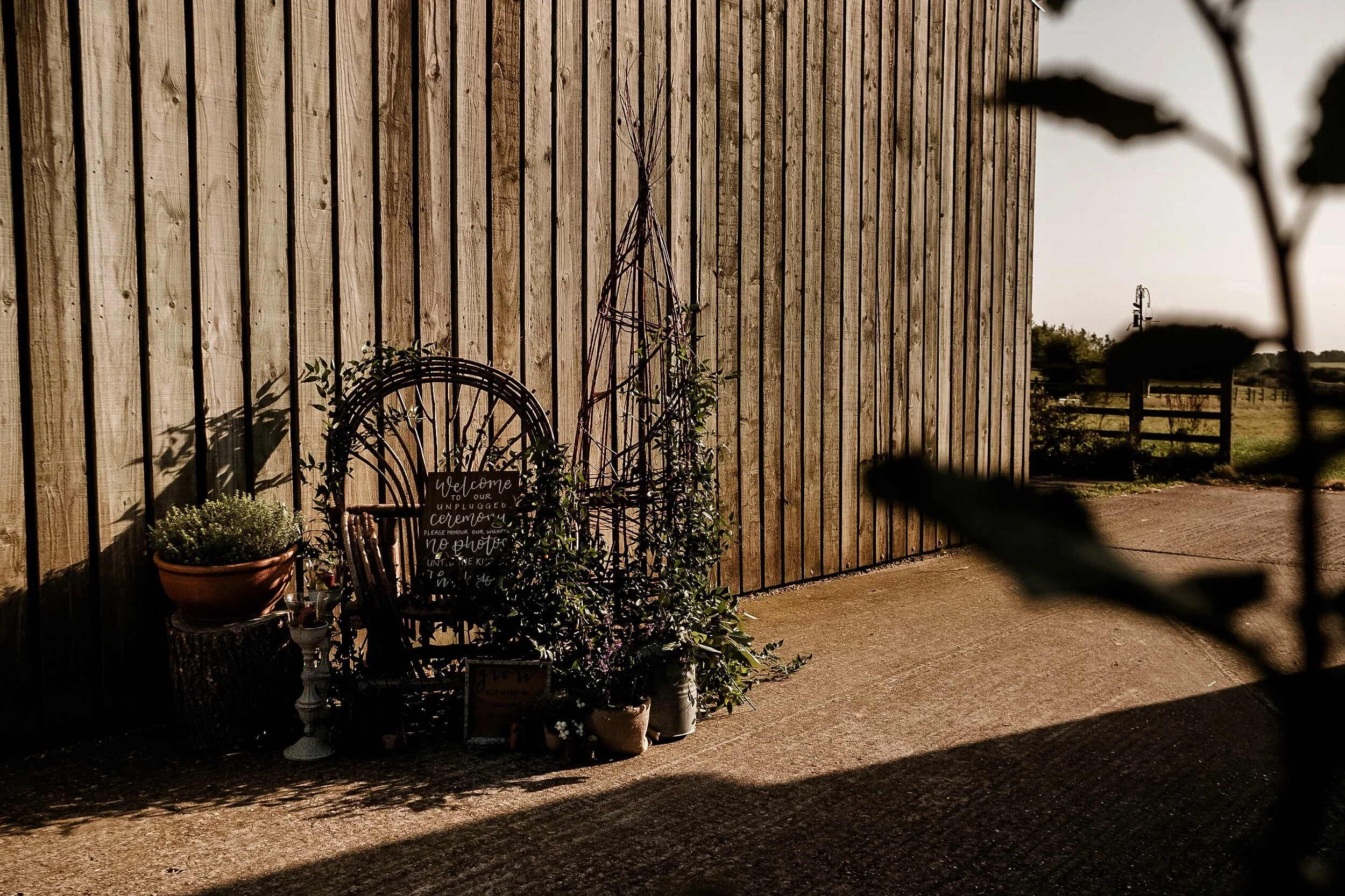 Rustic outdoor scene with a wooden wall, wicker chair, decorative sign, potted plants, and shadows cast on the ground.