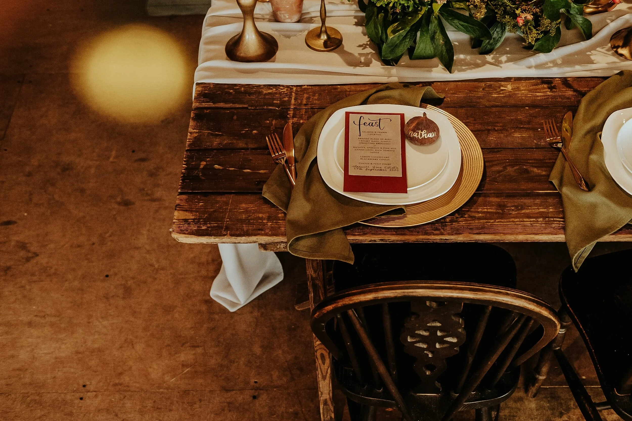 Rustic wooden table set for a formal dinner with plates, golden cutlery, an olive green napkin, a menu card, a small personalized ornament, and floral centerpiece.