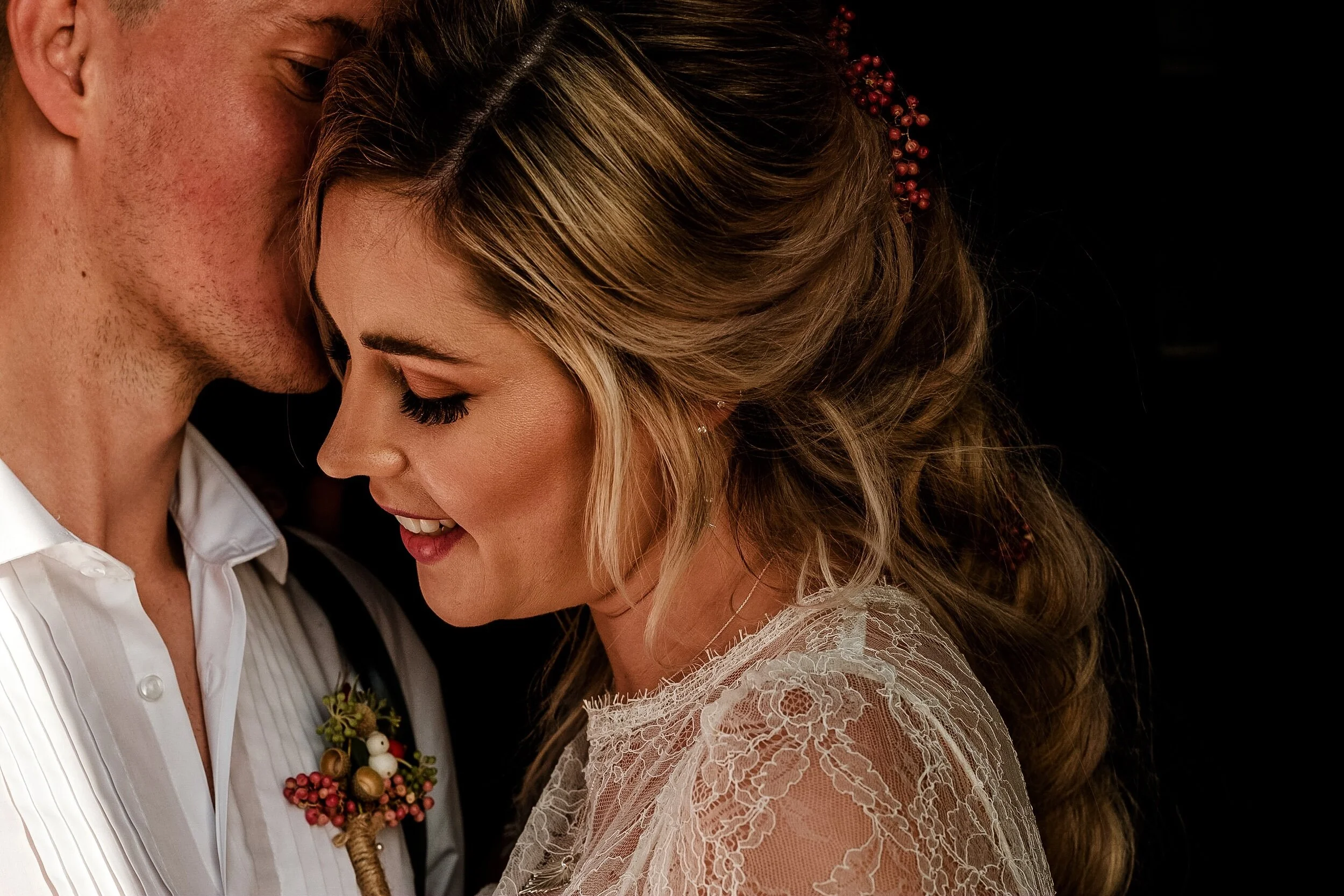 Close-up of a bride in a lace dress and groom in a white shirt, both smiling intimately.