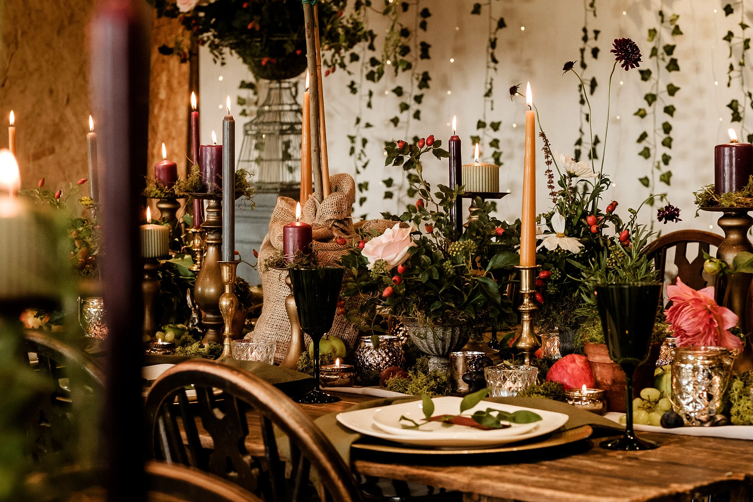 Decorative table setting with candles, flowers, greenery, and tableware set on a rustic wooden table.