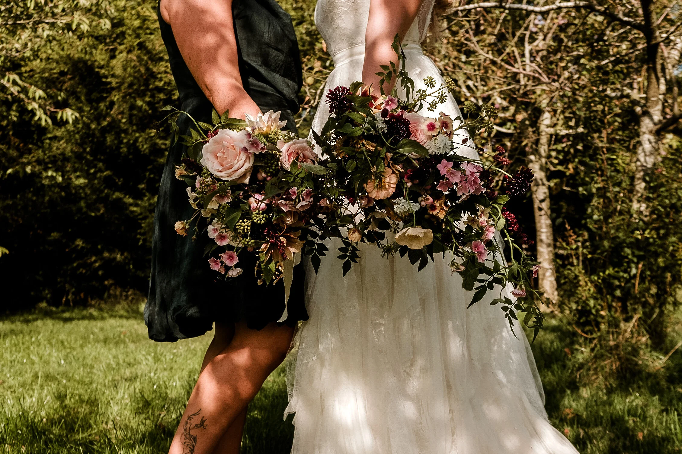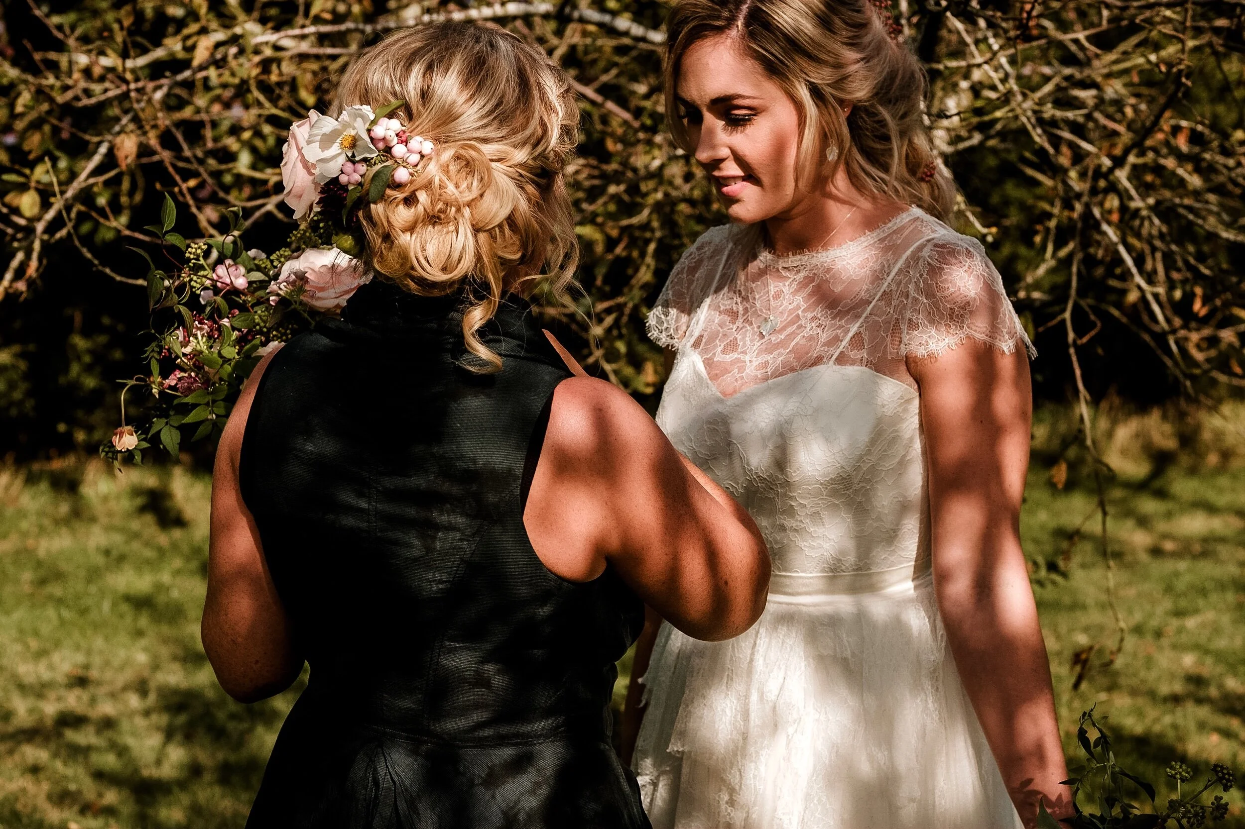 Two women in a garden, one wearing a wedding dress and the other with flowers in her hair.