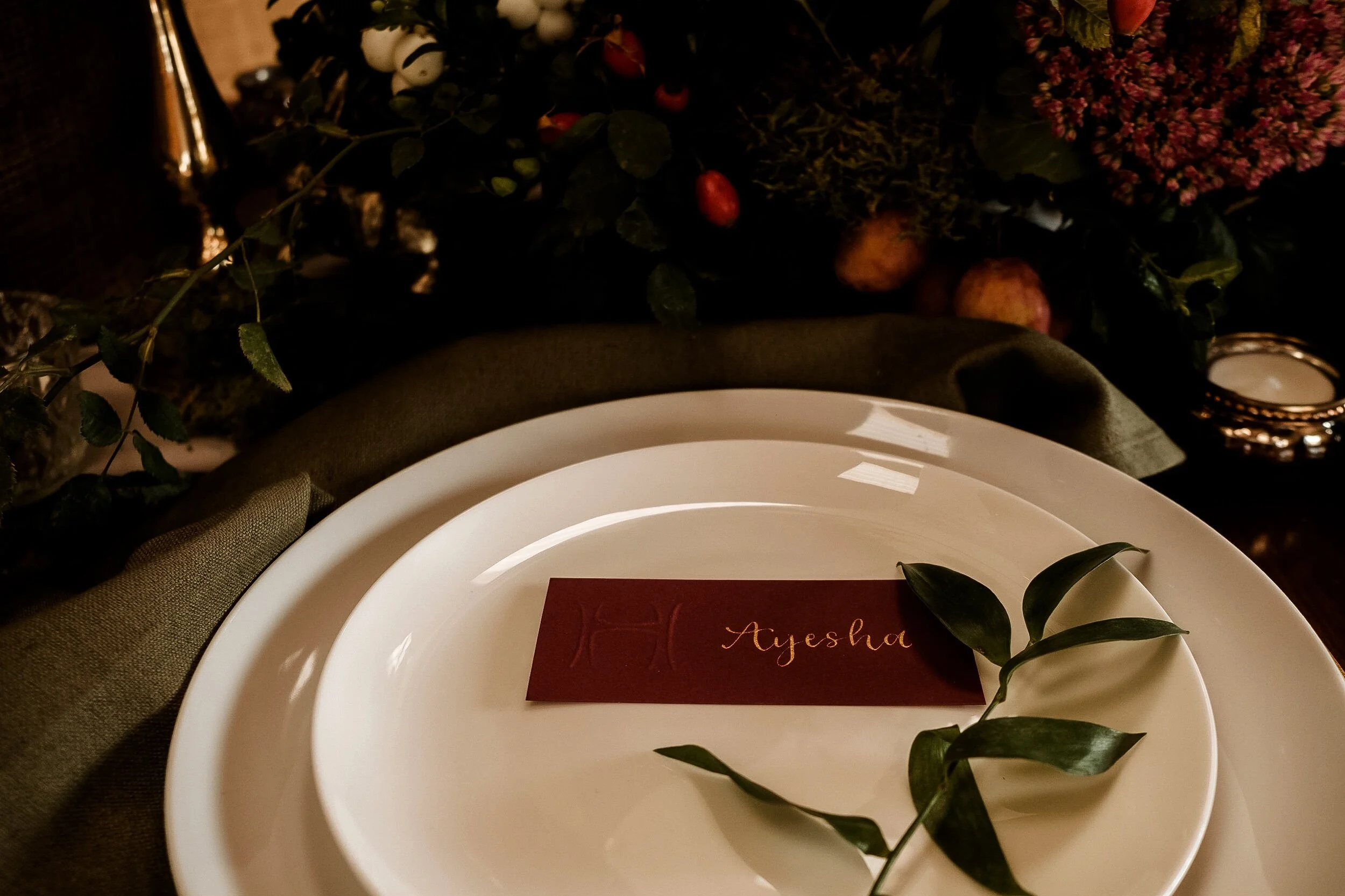 Elegant table setting with white plates, a maroon name card with gold writing, green leaves, and floral arrangement in the background.